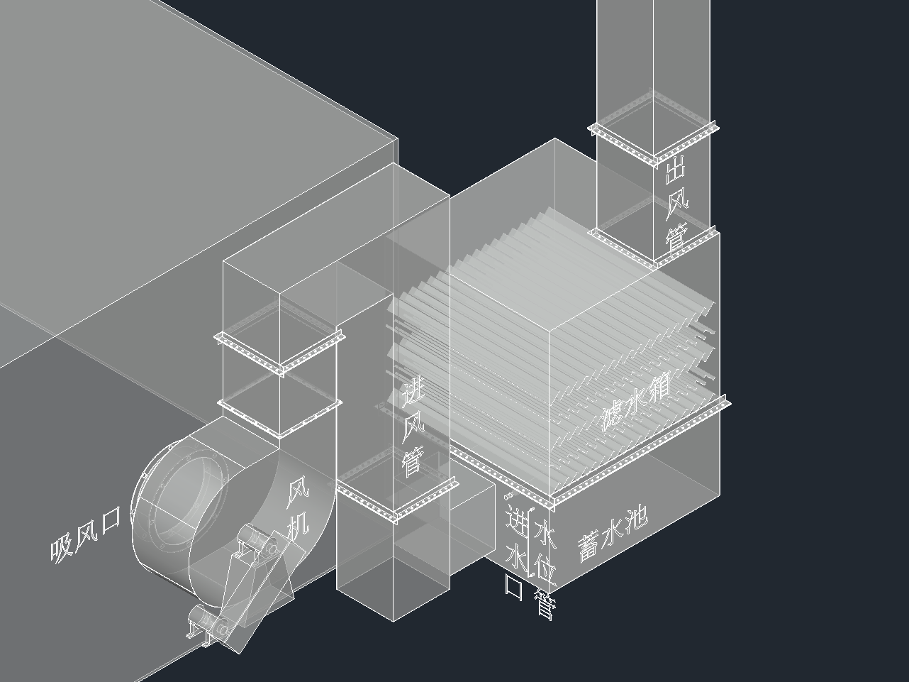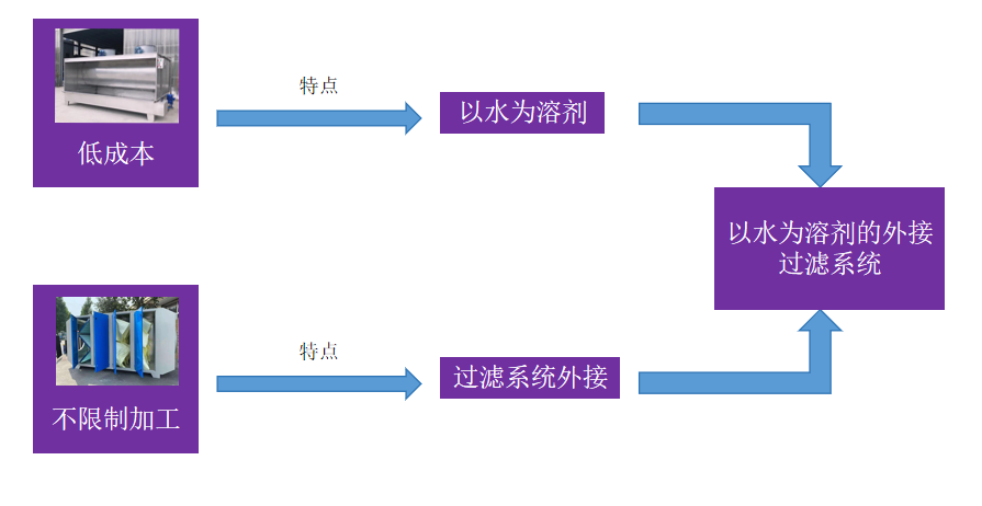 面对传统处理方式带来的问题,技术团队提出解决方案——以水为滤材的外接过滤系统。该装置结合了水帘柜的低成本性和干式过滤的尺寸灵活性,通过大功率风机来收集油漆雾。