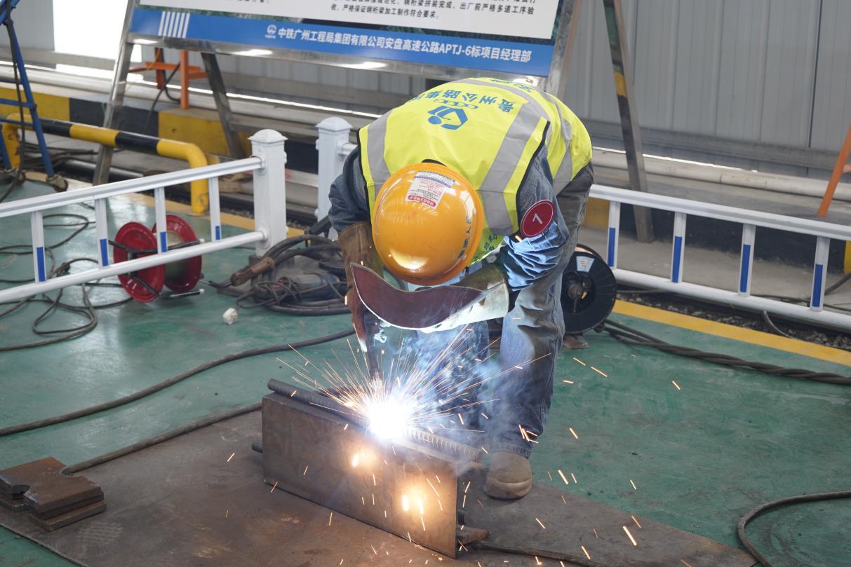 此次比赛聚焦工程建设核心工序,设置钢筋双面搭接焊,采用二氧化碳保护焊和电弧焊进行实操比武。比赛中,安盘7标奠传东沉着冷静,操作娴熟,精准控制焊接方向,灵活调整焊丝角度,确保熔池温度场与熔孔尺寸形状达到最佳平衡,充分展现日常积累的专业素养与技术实力。