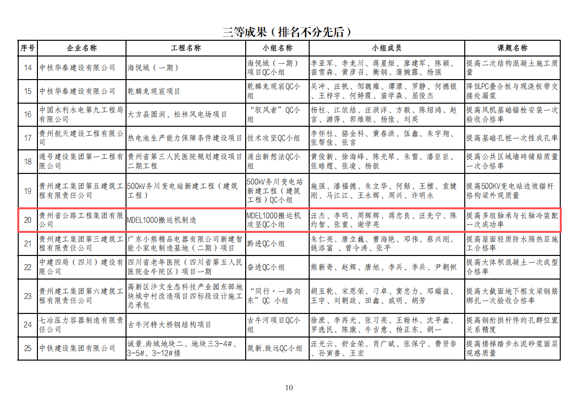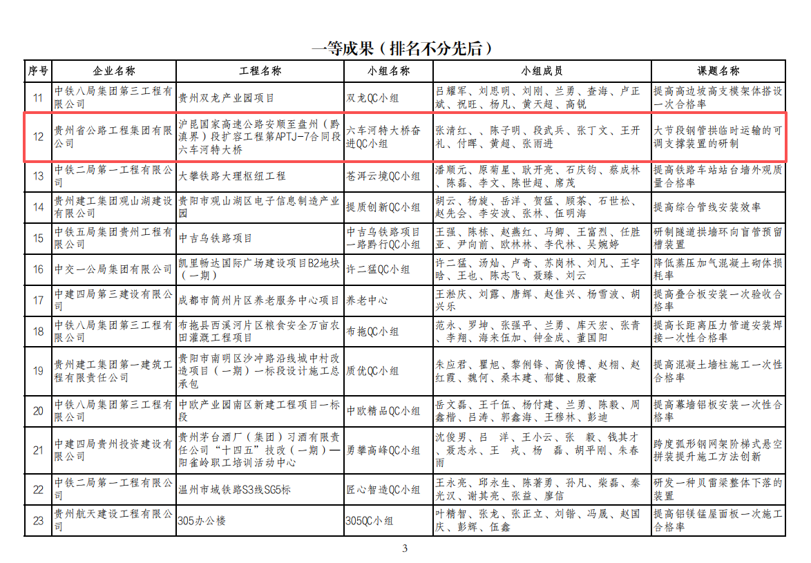 近日,贵州省建筑业协会公布了2025年度工程建设质量管理小组竞赛活动结果,贵州公路集团第三分公司安盘7标项目申报的“大节段钢管拱临时运输的可调支撑装置的研制”“提高多组轴承与长轴冷装配一次成功率”两项课题,在众多参赛成果中脱颖而出,分别荣获一等成果、三等成果。