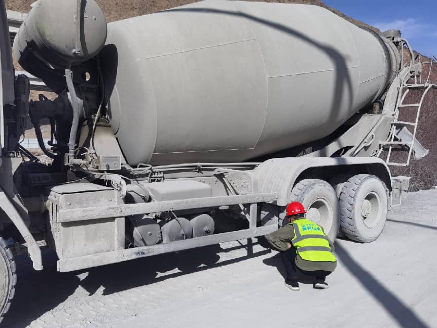 工作人员对混凝土罐车进行检查