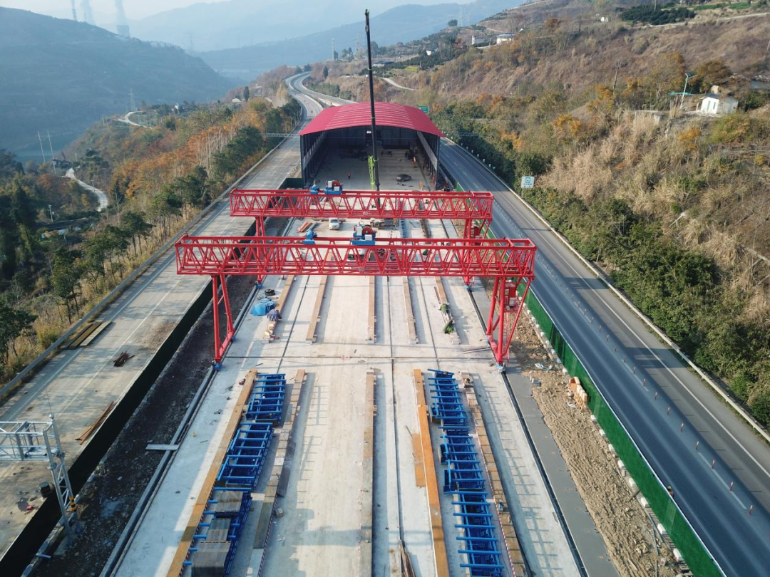 奉建1标项目设有新建桥梁28座,隧道1座,桥隧比高达95%,且项目红线范围内不具备设置预制梁场条件。经第六工程公司及项目部多次现场勘察对比,最终选择向奉溪高速“借地产梁”,将1#梁场设置在因项目改扩建需求而半幅通行的奉溪高速孙家崖隧道进口分离式路基中间位置,该段落地势平坦、宽阔,占地约25亩,距离项目起点较近,约3.48公里。