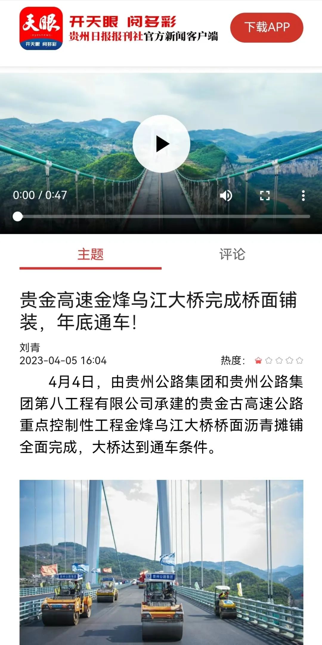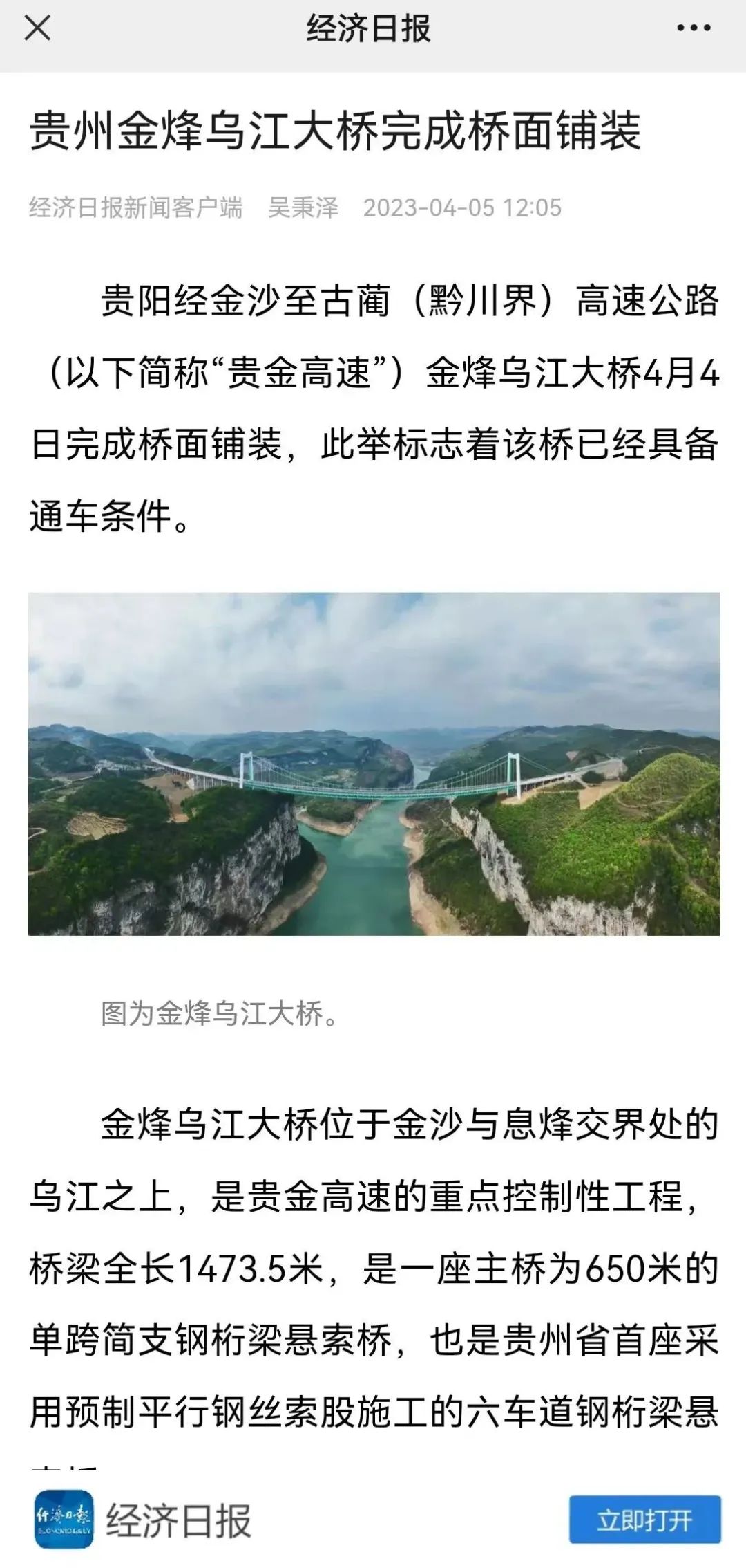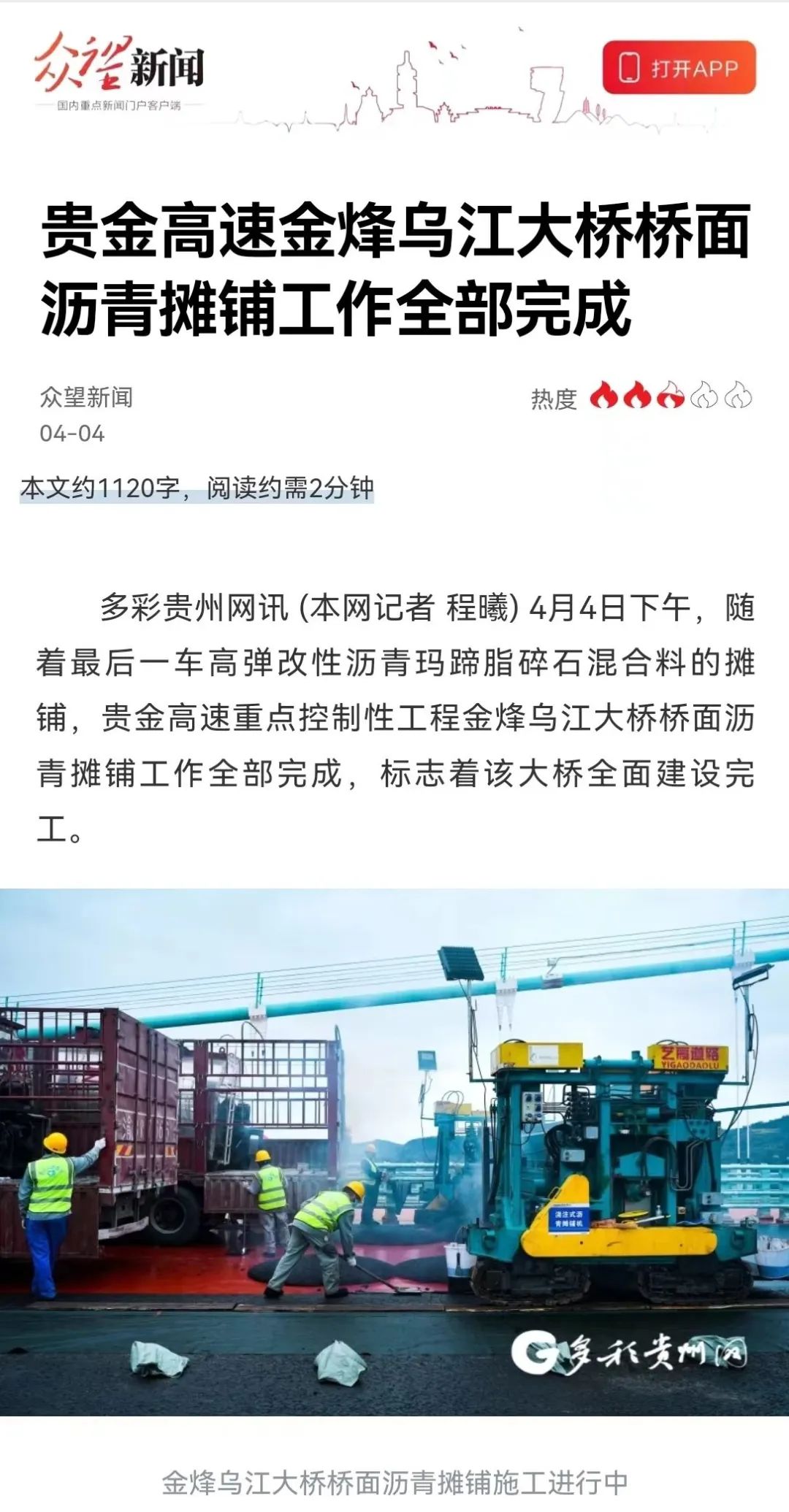 4月3日,新华社、人民网、经济日报和贵州广播电视台、贵州日报、多彩贵州网等10余家主流媒体记者走进贵州公路集团第八工程公司承建的贵金高速路面三标施工现场,聚焦金烽乌江大桥钢桥面铺装施工,讲述贵州公路人高品质建桥的故事。