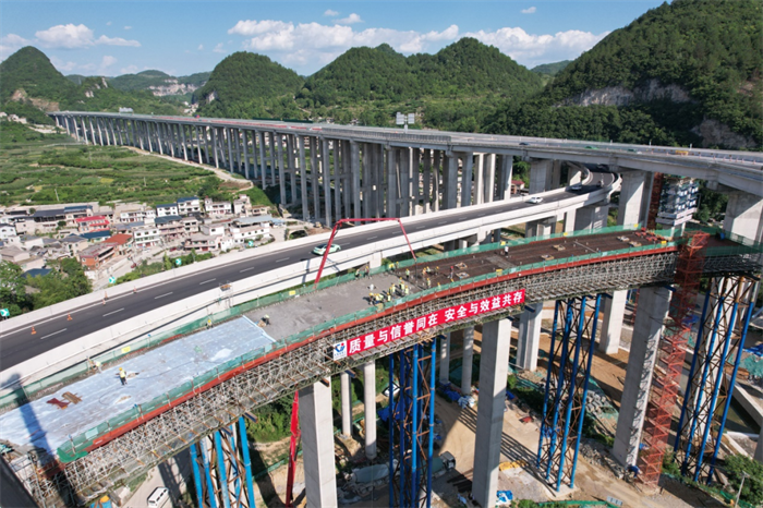 近日,由贵州公路集团第七工程有限公司承建的贵阳至黄平高速公路延伸段项目一分部冯家庄枢纽互通式立交F匝道桥首联现浇箱梁顺利完成浇筑。