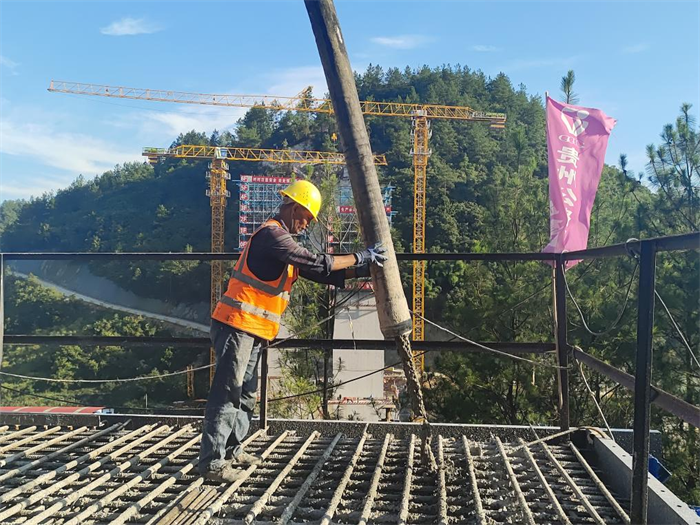 龙井沟特大桥是贵平2标的控制性工程之一,主桥采用连续刚构设计,全长1183.8米,最大跨度160米,设有主墩2根。其中7#主墩承台长21.3米,宽32.5米,高6.5米,混凝土浇筑量达4500立方米,浇筑时长达50小时,是项目5个4500立方米的大体积混凝土结构之一。