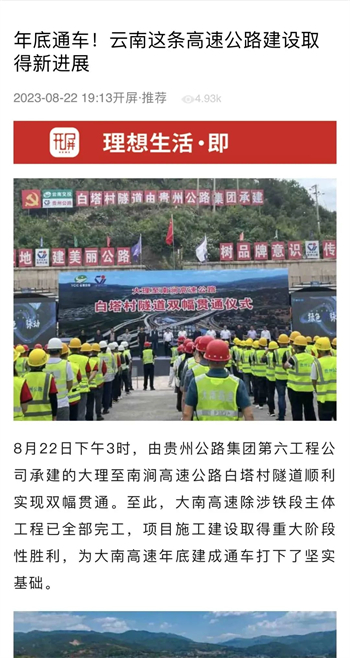 大南高速白塔村隧道顺利贯通,折射出贵州公路集团参与的不仅是国内大循环,更是面对省内公路特别是高速公路建设市场逐渐萎缩的状况下,寻找突破口,在积极融入国家战略中赢得发展。隧道贯通后,受到了央视新闻、人民网、天眼新闻、动静贵州、云南日报、大理新闻等主流媒体的高频聚焦报道。