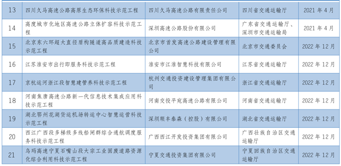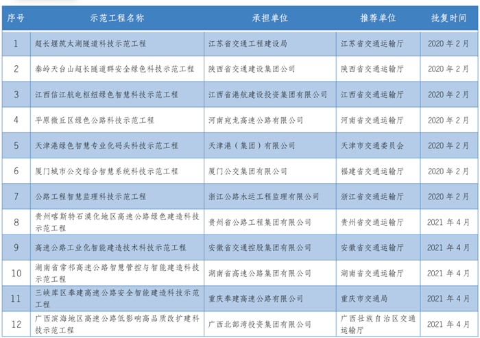 交通运输科技示范工程依托重大工程或重点项目,集中开展关键技术攻关、中试验证和推广应用,是部促进科技创新的重要抓手。2020年以来,交通运输部共批复创建21项交通运输科技示范工程,涉及17个省(自治区、直辖市),覆盖综合交通运输各领域,充分体现了安全、智慧、绿色发展理念,为新阶段加快建设交通强国提供了有力支撑。