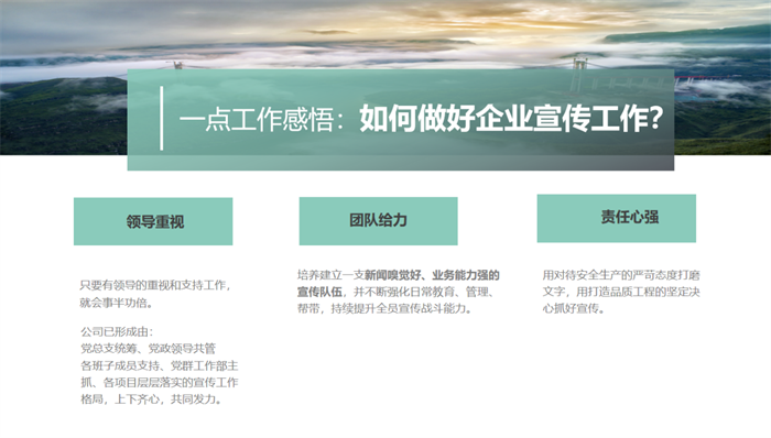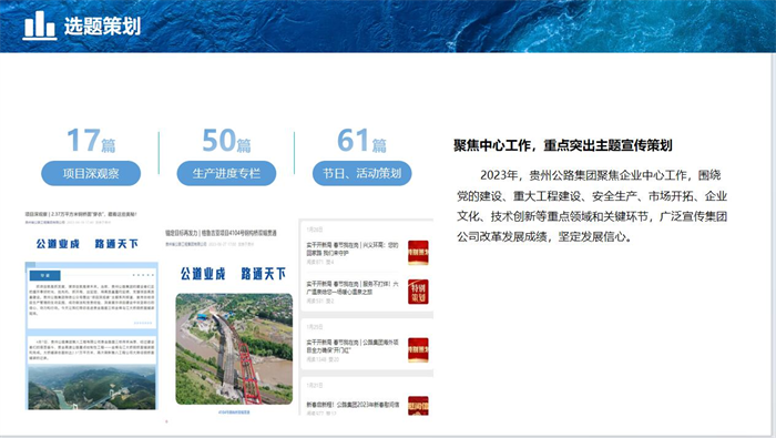 “全过程跟踪拍摄”“记录项目成长”……第六工程公司以牂牁江大桥、金州大桥等在建项目为例,讲述了全过程宣传报道机制下,两个项目在对外宣传上取得的成果,并从制定年度宣传工作要点、排好工程节点计划清单、借助媒体力量和加强督导检查等方面介绍了工作经验。