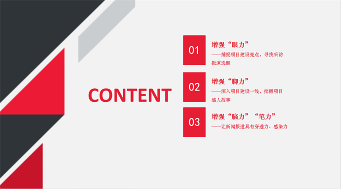 “做好项目深度报道,首先就要到项目、到现场”“去看、去听、去感动”……第八工程公司以新闻“四力”(脚力、眼力、脑力、笔力)为切入点,讲述了做好项目深度报道的重点,并结合内蒙古安公一标、云南香维项目等实际采访案例,分享了在开展项目宣传报道时如何发现和获取好的新闻素材和感人故事,最后通过文字笔触写出好故事的经验。