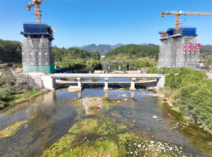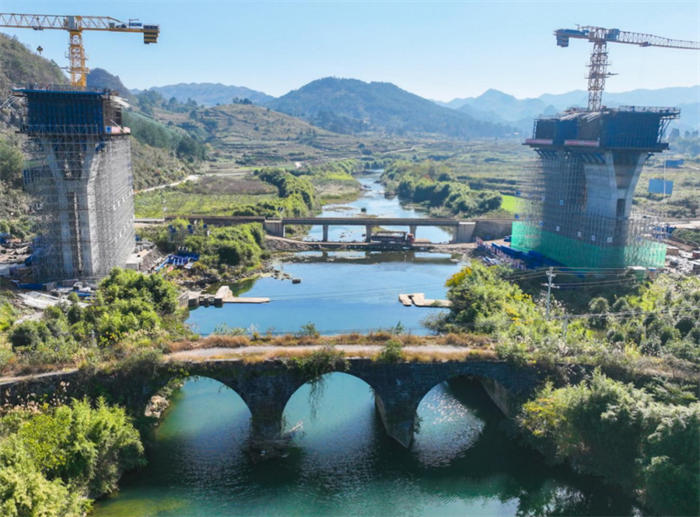 (前中后分别为:百年石拱桥—冗山桥、建设中的摆龙河大桥、简支梁桥)