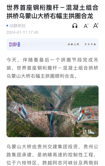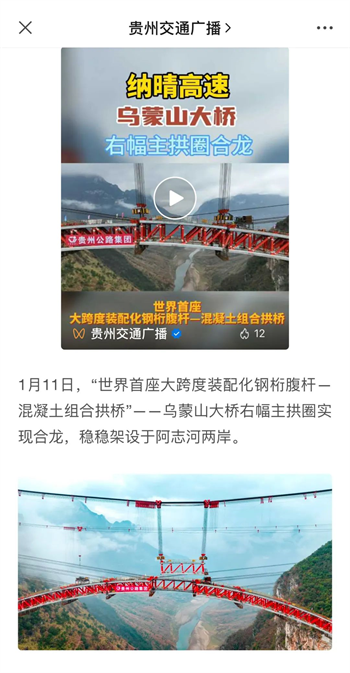 1月11日下午,随着右幅最后一个预制节段精准就位,由贵州交建集团投资,贵州公路集团第八工程公司承建的纳晴高速乌蒙山特大桥右幅主拱圈顺利合龙,为纳晴高速全线建成通车奠定了坚实基础。