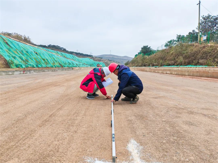 交验检测现场,交验组分别对弯沉、压实度、路基宽度、平整度、横坡、纵坡、边坡坡率等多项内容进行全面检测、分析,各项数据均满足设计及规范要求,验收小组一致同意通过验收。