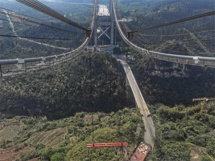 据悉,金州大桥作为贵州省跨径最大的市政悬索桥,主桥为单跨450米的钢桁架加劲梁,由42个标准节段与2个非标准节段钢桁梁组成,钢梁总重9120吨,采用缆索吊装工艺安装作业。为保障后期钢桁梁吊装施工的有序推进,金州大桥建设团队当日按照缆索吊装系统额定荷载重量的80%、100%、110%、125%逐级开展试吊试验,以验证该系统的起吊能力以及安全性。