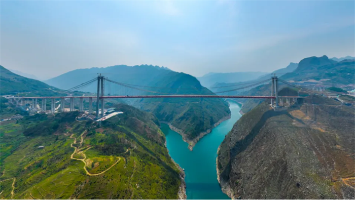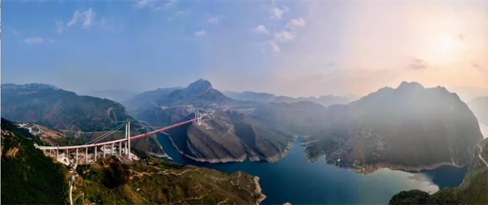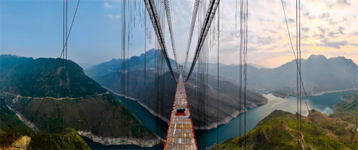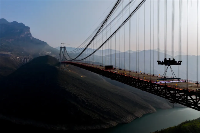 牂牁江大桥是纳晴高速重点控制性工程之一,地处贵州晴隆、普安、水城、六枝等4县(区)的交界处,横跨牂牁江,为双塔单跨钢桁梁悬索桥,全长1849米,主跨1080米,桥面至江面最高距离380米,桥梁高度在世界百座高桥中排名第12位。大桥主桥钢桁梁共有73个节段,最大重量为231.3吨,梁段总重量达1.6万余吨,采用现场拼装、缆索吊系统吊装的方式,从跨中向两岸同步对称架设。