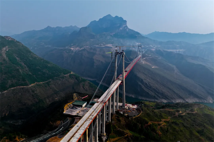 碧绿的牂牁江之上,贵州造桥团队用集体的智慧竭力托起一座世界级桥梁,纳晴15标建设团队积极围绕生态环保要求高、高墩混凝土泵送难、高空施工难度大等多个难点问题,探索创新了“2m×4m”大跨径特制贝雷片支架系统、中大跨径钢混组合梁斜拉扣挂顶推施工技术、高强度镀锌铝稀土合金密封钢丝绳吊索等5项重大科研创新,单台天车双吊索平衡纵向运输施工方法、悬索桥缆索施工多功能高效牵引系统,以及主墩墩柱模板底口应用止浆工艺、汽车吊配合龙门吊出渣工艺等20余项工艺工法,有效降低了施工风险、提升了施工效率,提升了工程建设品质。