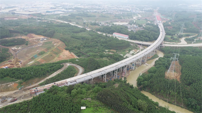 飞马特大桥设计桥长1089米,平曲线半径1120米,上部构造采用40米预应力砼T梁,共计290片,为先简支后结构连续。桥位起点接西湾服务区,终点接西湾互通,左幅已于今年2月3日贯通。