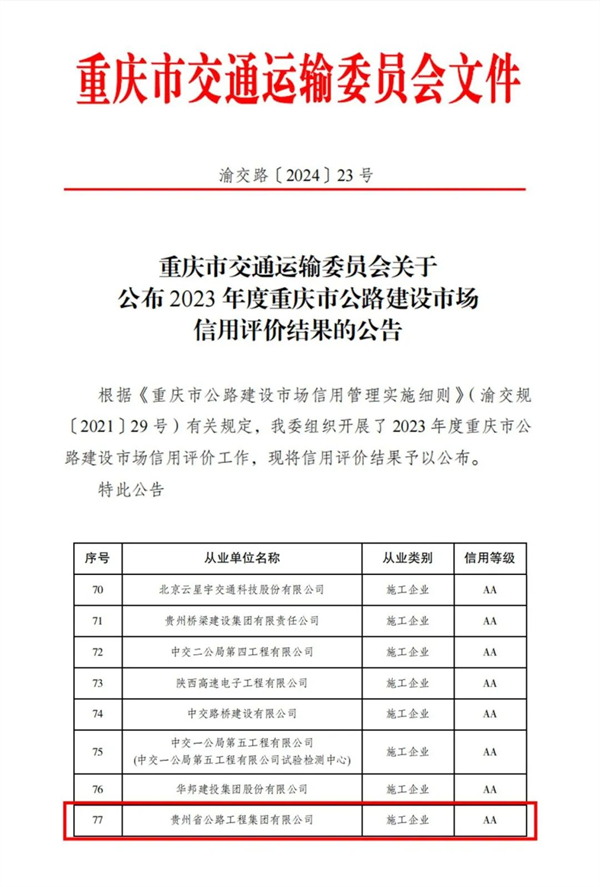 再次获得“AA”级信用评价,是重庆市交通运输委员会对贵州公路集团在履约能力、管理水平等方面的高度肯定,将为集团进一步拓展川渝市场、树立行业品牌、提升核心竞争力提供强有力的信誉支撑。