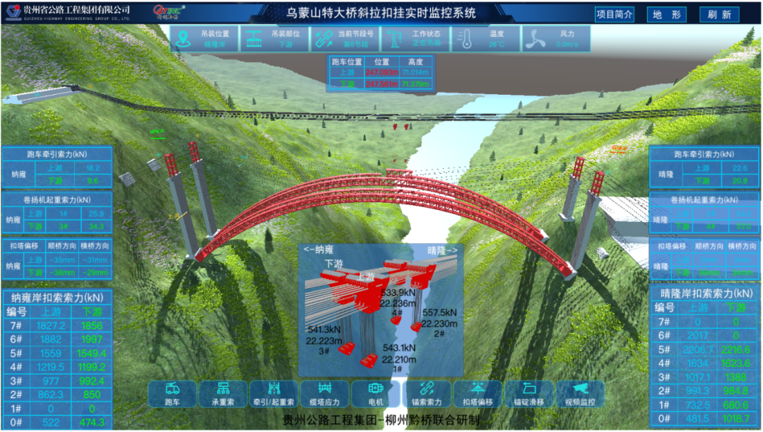 为保证高质量完成乌蒙山大桥主拱圈吊装任务,贵州公路集团建设团队科学统筹节段吊装具体流程、人员配置、安全防护及应急措施,依托智能监控系统,强化吊装过程监测,由专人专岗对施工过程中吊具、跑车、塔偏、索力、卷扬机电机工作健康状态等关键风险点进行实时监测和超值预警,实现施工关键数据的实时采集、远程传输和云平台展示,不仅提高了施工效率,降低了施工成本,还减少了高空作业风险。