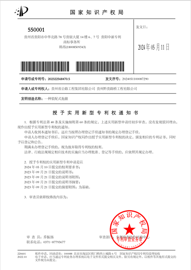 “装配式抱箍”获得国家知识产权局实用新型专授权