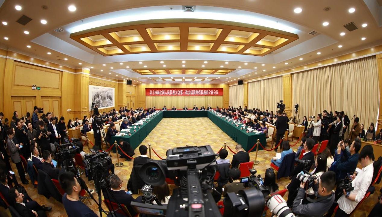 3月6日上午9时,十四届全国人大三次会议贵州代表团在驻地举行全体会议。根据大会安排,本次会议向中外媒体开放。会议分两个阶段进行:一是审议政府工作报告,二是回答记者提问。58家中外媒体、124名记者到场采访。