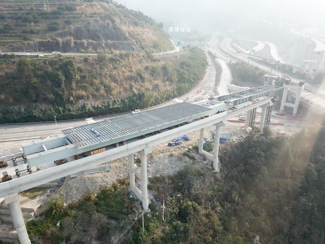在建的重庆奉建高速唐家湾特大桥,是全线重点控制性工程——奉节东枢纽互通的主线桥。大桥位于重庆市奉节县费门街道与沪蓉高速夔门互通附近,沿长江支流梅溪河岸线布置,跨越2条支流溪沟汇入口、1条石油管道,以及通行的G12沪蓉高速、奉溪高速,施工环境极为复杂。在施工过程中,项目建设团队以不同工艺应对复杂地形,将大桥建成一座集预制T梁、现浇箱梁、连续刚构箱梁、钢混叠合梁四种工艺于一身的桥梁施工“活体博物馆”。