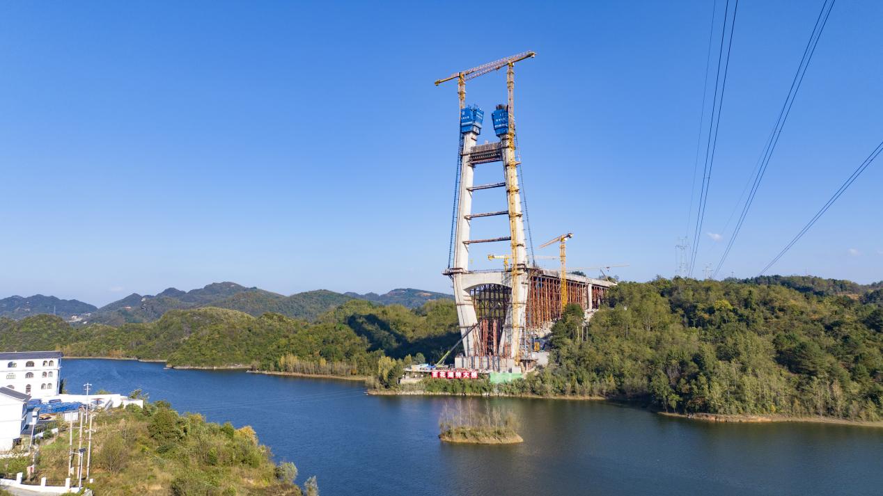 2024年11月11日,百花湖大桥11号主塔上横梁完成。