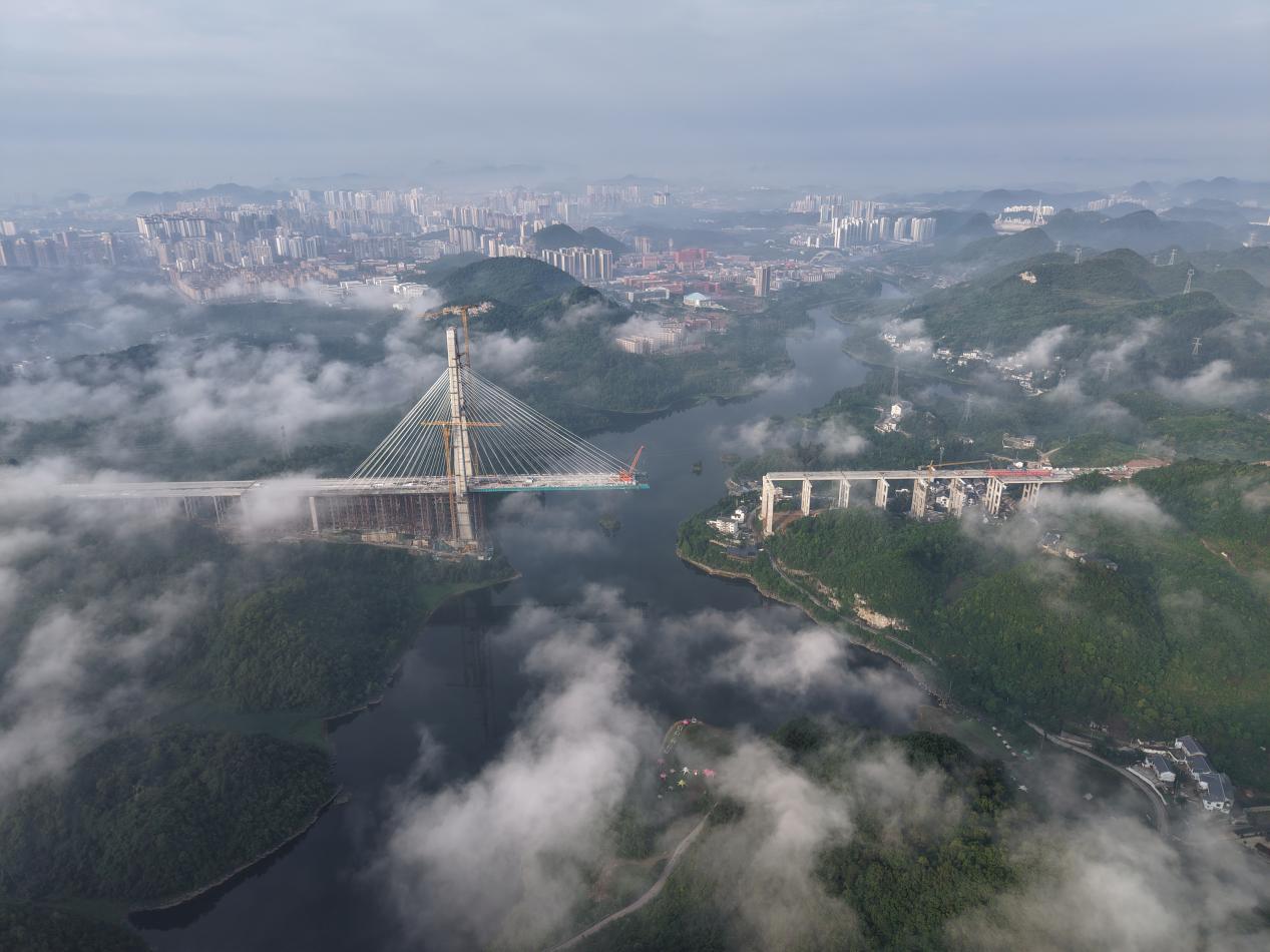 百花湖大桥是贵州省内同类型最大规模混合梁单塔斜拉桥,大桥全长1086米,主塔高219米。项目位于贵州省清镇市与观山湖区交界处,横跨百花湖二级水源保护区,主塔毗邻百花湖,环水保要求极高。自2023年3月桩基施工启动以来,项目团队高度重视生态环境保护,采用闭环管理模式,通过三级沉淀池、浆液分离系统等技术实现施工污水零排放,未发生任何水源污染事件。针对富水岩溶桩基、超高混凝土主塔建设等技术难题,项目团队研发应用了空压反循环清孔净化装置、大体积混凝土智能温控系统等关键技术,创新塔梁同步施工、纵移式桥面吊机钢混结合段施工等工艺,高质量完成桥梁主体工程建设。
