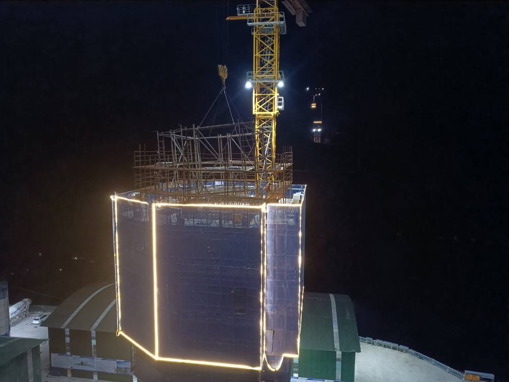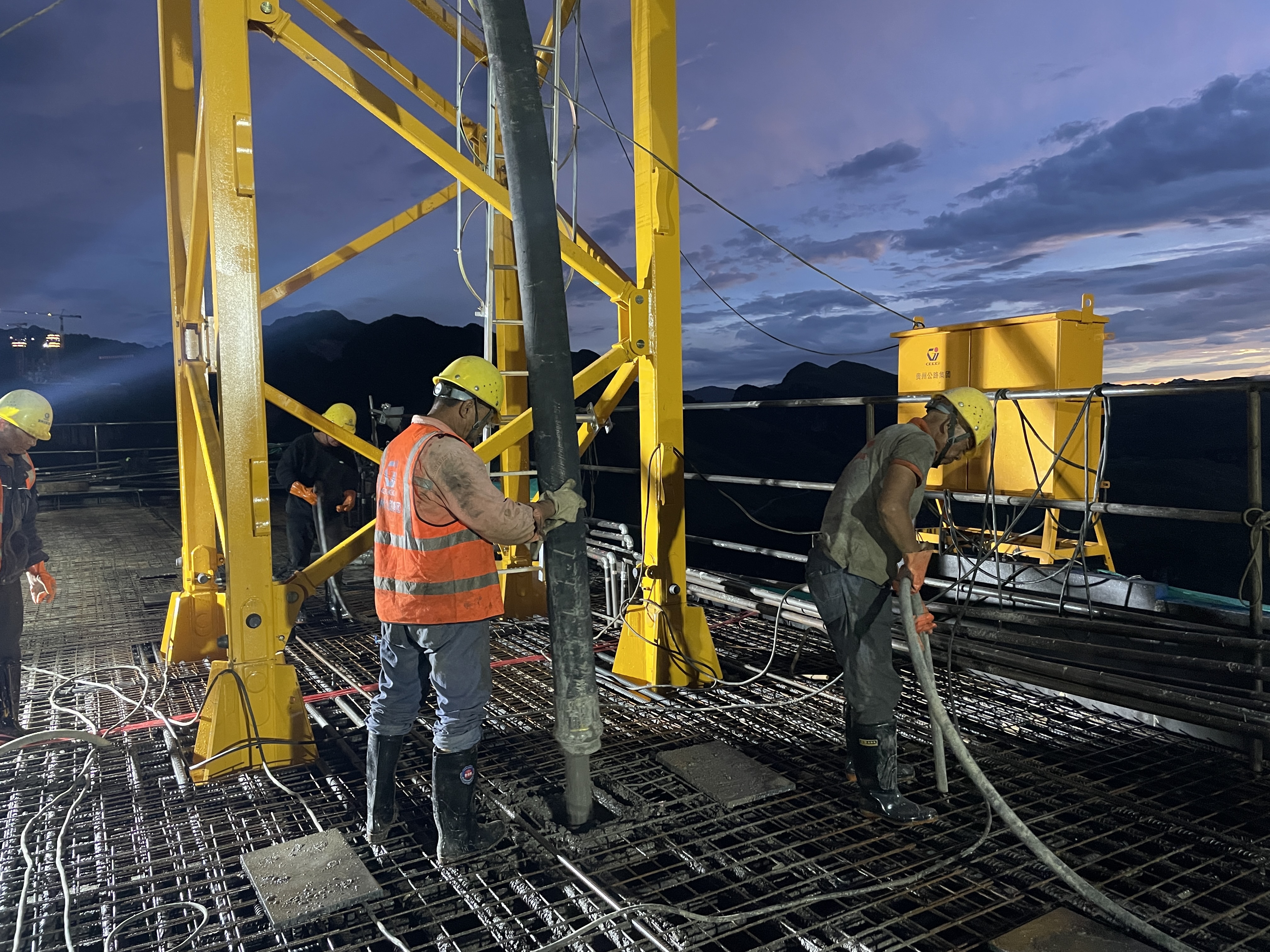 C55混凝土超高泵送入模,面临结构局部钢筋密集、振捣困难等挑战。解决262米主塔混凝土一次泵送到顶的技术关键,在于高标号C55泵送混凝土工作性能要求能达到超流态和自密实效果。为攻克“高标号C55混凝土超流态和自密实技术”,项目团队通过反复试配分析,优化配合比,成功解决超高泵送和主塔结构局部空间小、钢筋密、无法振捣的技术难题,并提前39天完成主塔施工任务。