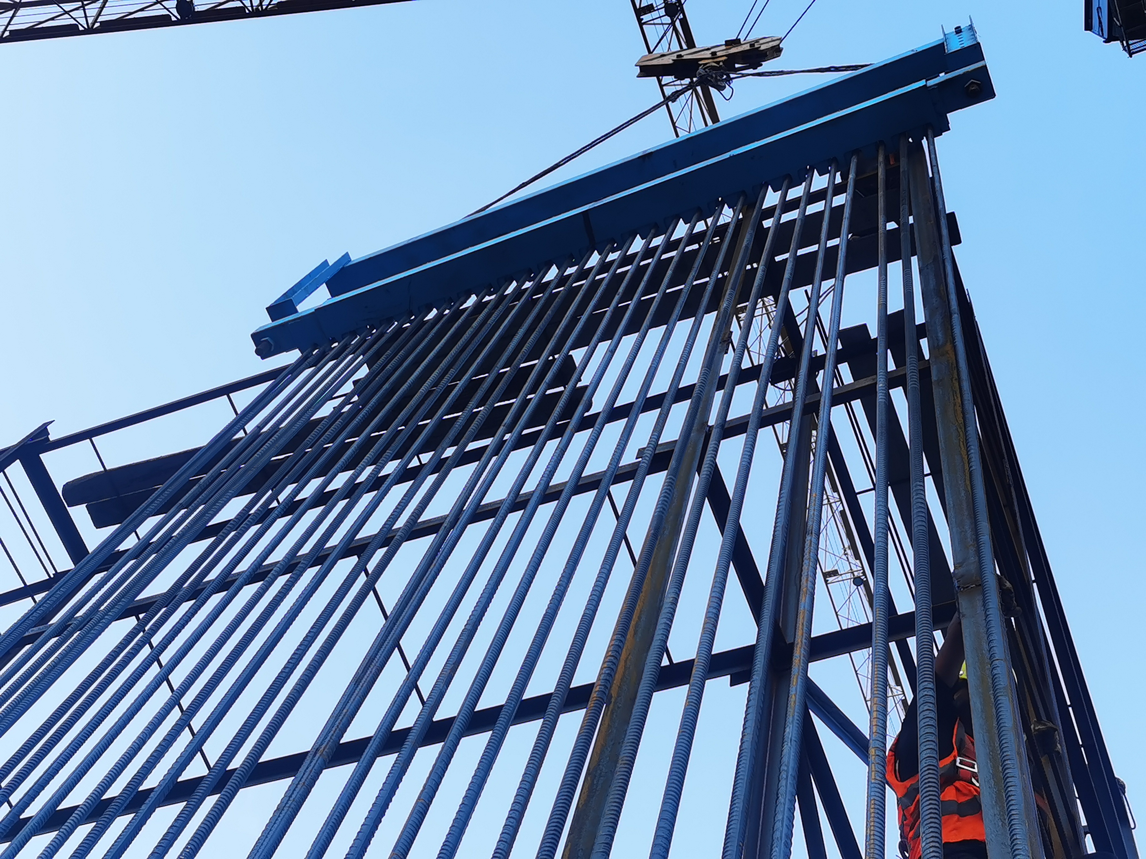 主塔钢筋安装体量大、运输难、高空作业风险高,起吊到塔顶仅凭人工搬运,费时费劲,严重影响施工进度。项目创新采用节段主筋模块化吊具吊装施工工艺,设计专用吊具,在地面上将主筋依次放入专用吊具横梁预留槽口中完成主筋排布后,整体起吊至墩顶完成批量节段主筋吊装和精准对接,将工作顺序作业改为平行作业,显著减少高空作业量和节省工作时间,保障施工安全性的同时,也提升了安装效率与施工质量。
