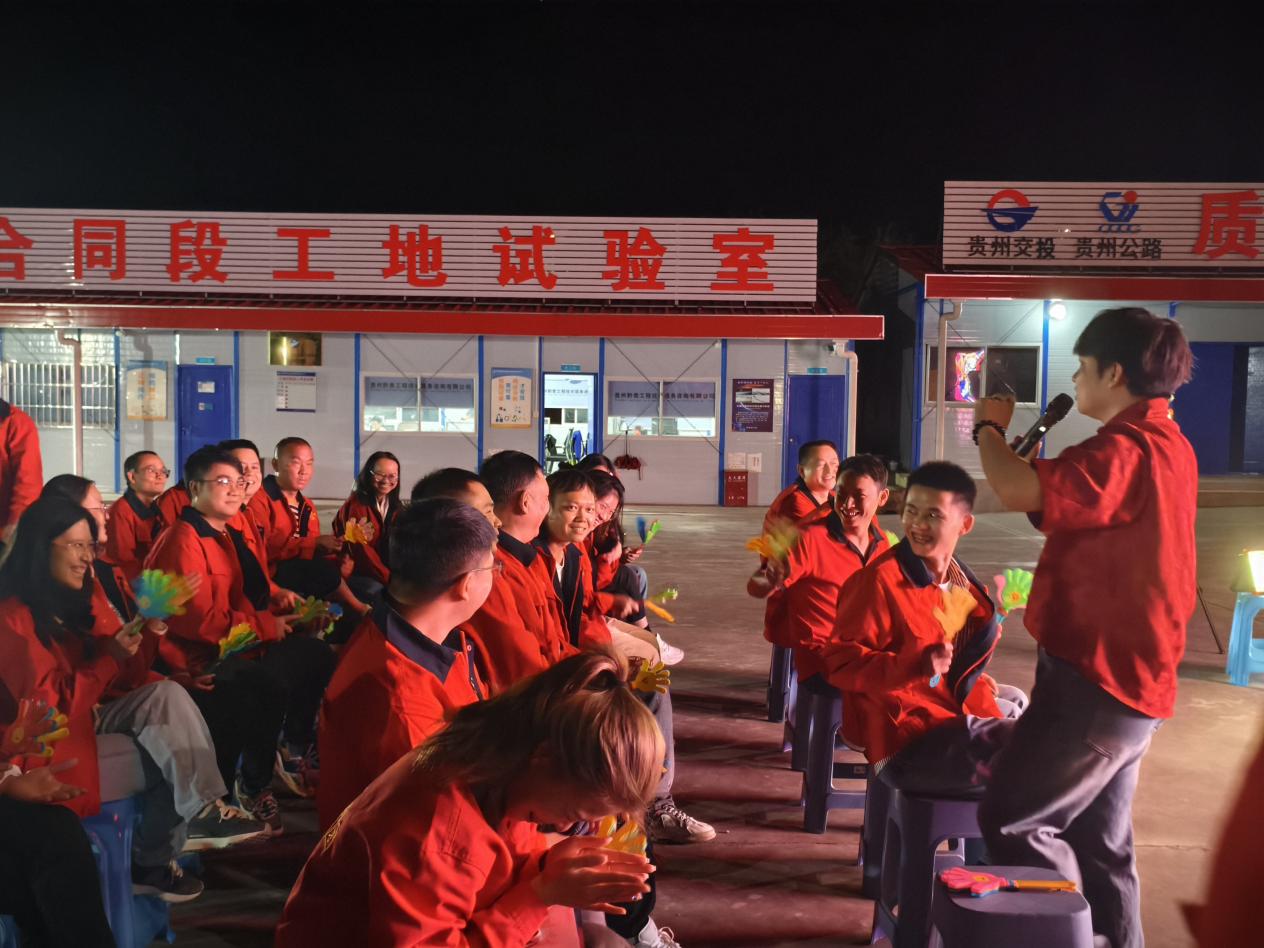 在第八工程公司贵平路面2标项目,活动在项目职工对祖国的美好祝愿中拉开序幕,来自建设一线的青年职工深情朗诵《这盛世如您所愿》,一字一句、一言一语,表达了对祖国繁荣昌盛的无限热爱。热烈之后,专业的喜剧脱口秀演员们闪亮登场,用幽默风趣的语言、生动多彩的表演形式,引得大家笑声连连,忙碌了一天的疲惫的脸上绽放出轻松的笑容。