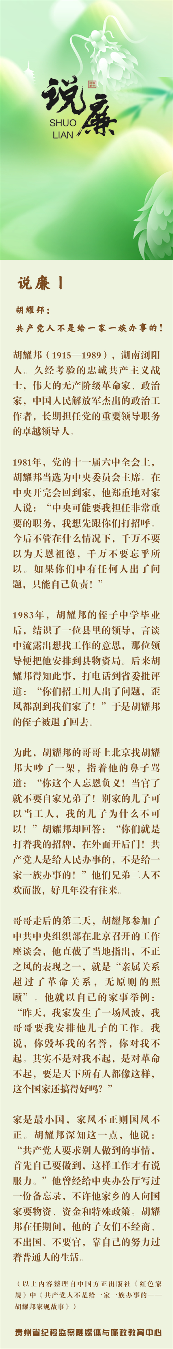 说廉丨胡耀邦:共产党人不是给一家一族办事的!