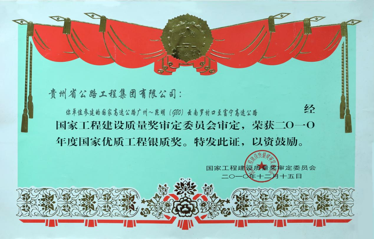广州至昆明(g80)云南罗村口至富宁高速公路荣获2010年度国家优质工程银质奖