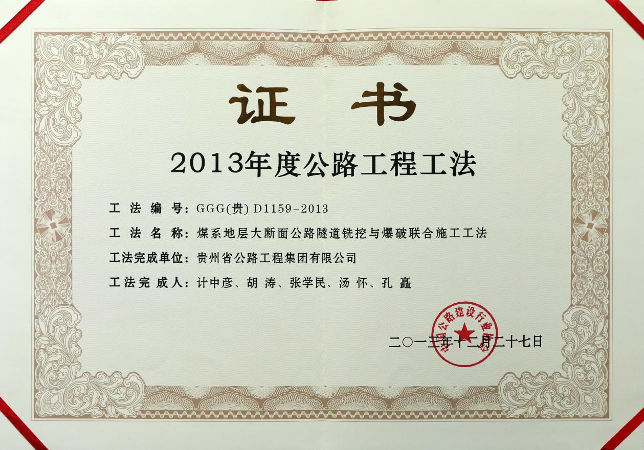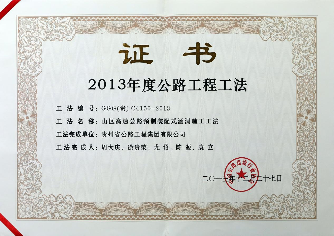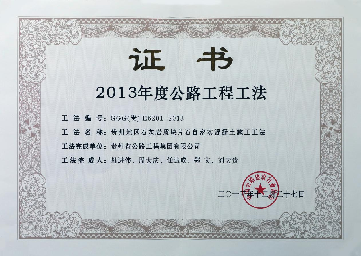 2013年度公路工程工法(贵州地区石灰岩质块片石自密实混凝土施工工法、煤系地层大断面公路隧道铣挖与爆破联合施工工法、山区高速公路预制装配式涵洞施工工法)