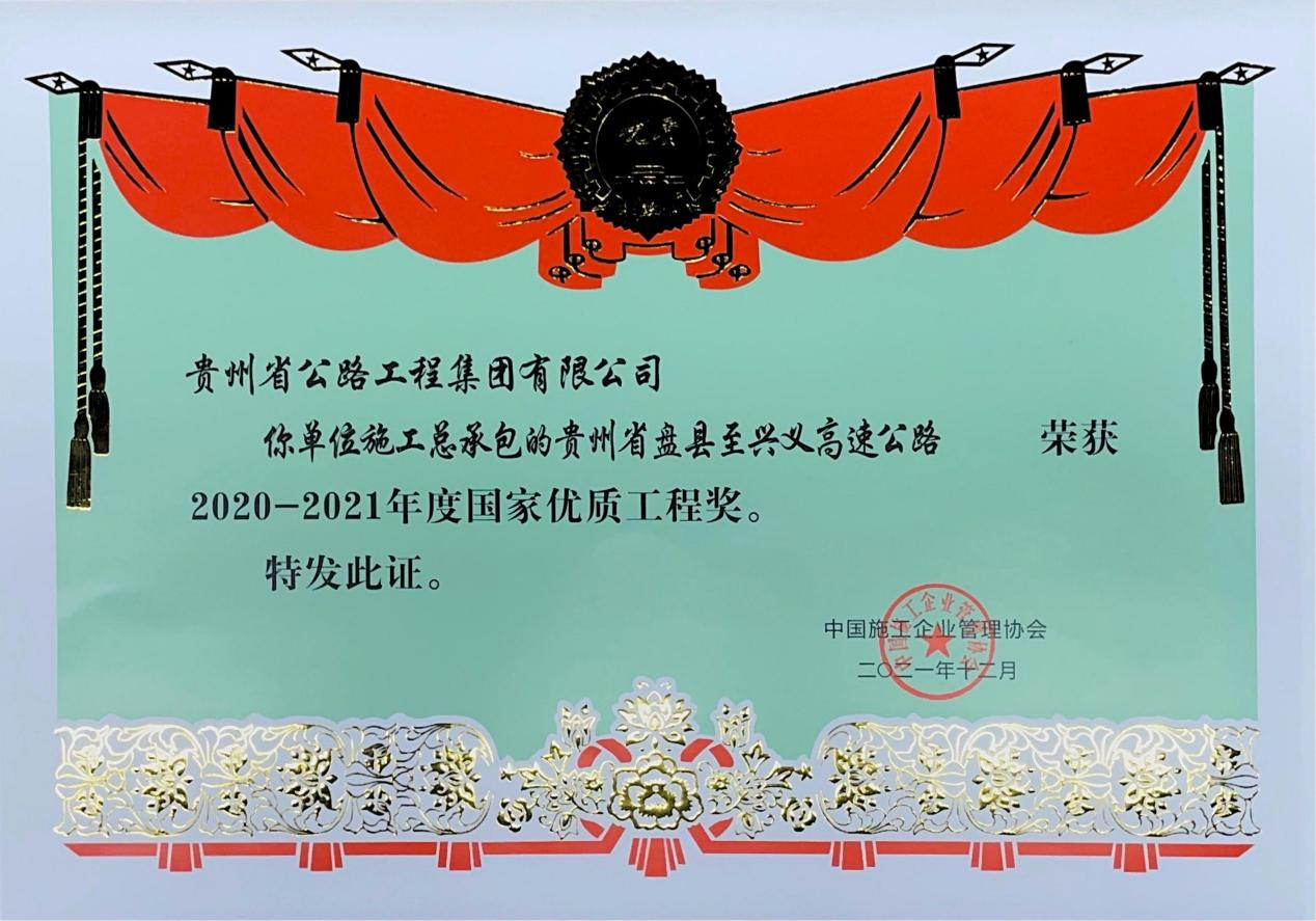 贵州省盘县至兴义高速公路荣获2020—2021年度国家优质工程奖