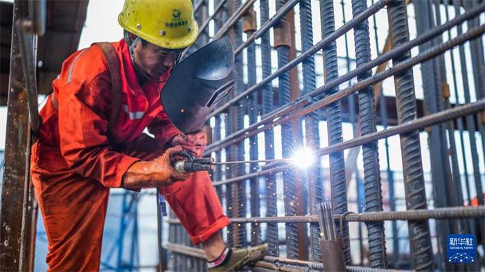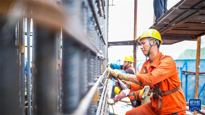 贵州公路集团工人在花江峡谷大桥5号主塔进行施工(8月3日摄)。新华社记者 陶亮 摄