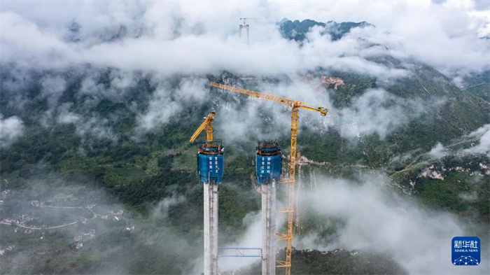 正在修建中的花江峡谷大桥5号主塔(8月3日摄)。新华社记者 陶亮 摄