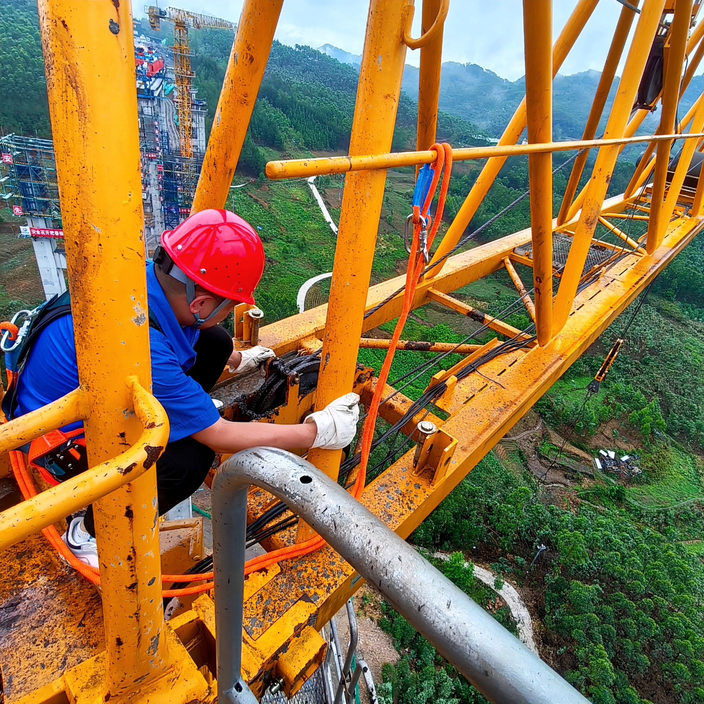安全员对项目现场塔吊、龙门吊、架桥机、安全爬梯等多台(套)设备开展高强度排查,针对部分设备存在螺栓松动、轨道积水等隐患,立即采取螺栓复紧、轨道排水疏通、设备限位锁定等应急措施,并暂停高危设备使用,确保隐患“动态清零”。