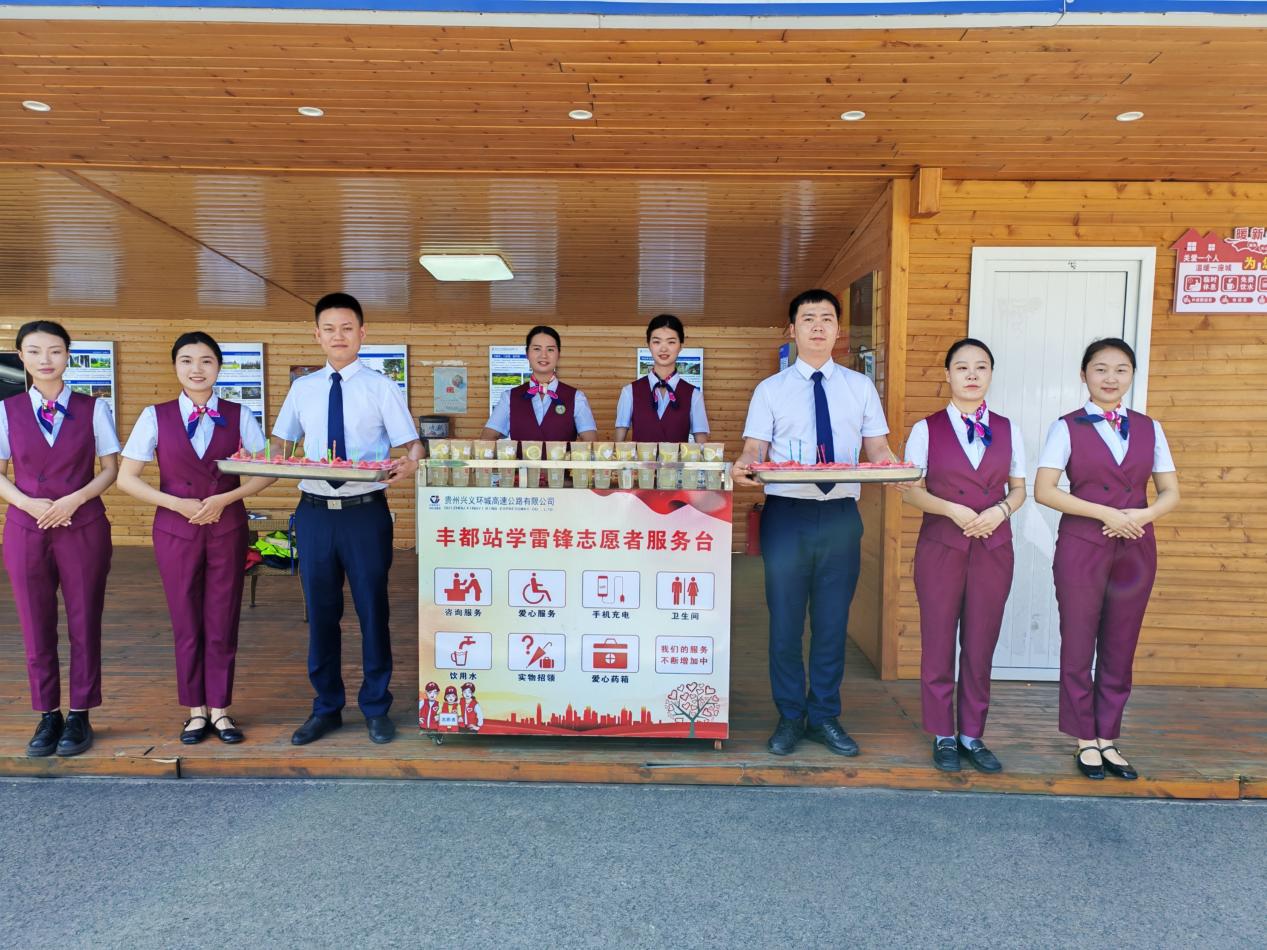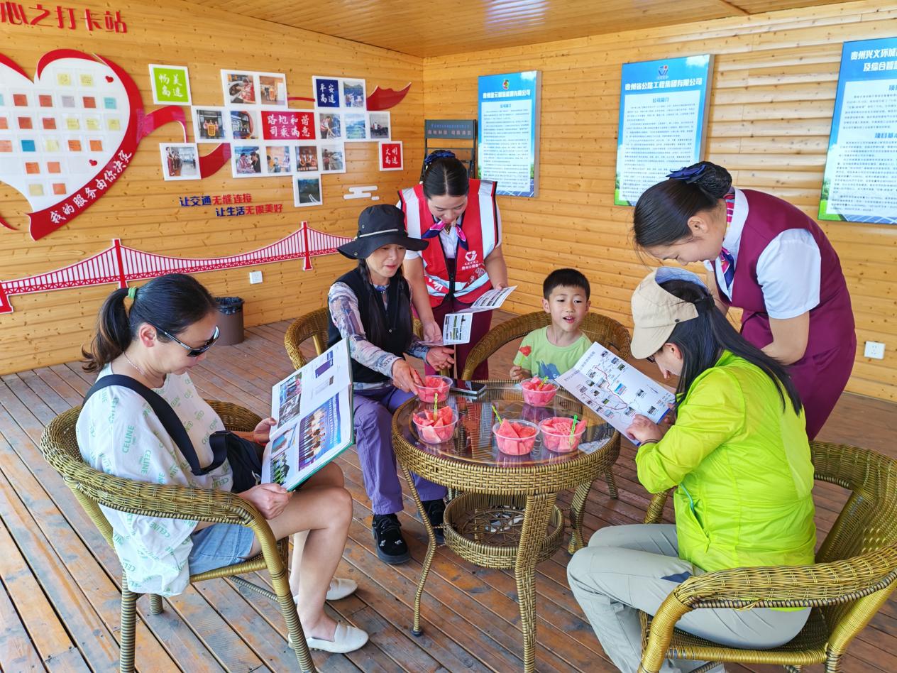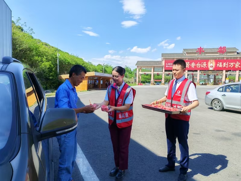 除高效调度外,兴义环高“红背心”高速管家服务队化身旅途“暖心后盾”,在沿线收费站设置“清凉补给站”,提供应急药品、维修工具及充电设备等物资。5月3日,一辆外省游客车辆因导航设置问题滞留丰都收费站,服务队员主动送上冰镇西瓜,并详细规划前往万峰林景区的路线,贴心标注沿途景点与拍照点位,获游客连声称赞。