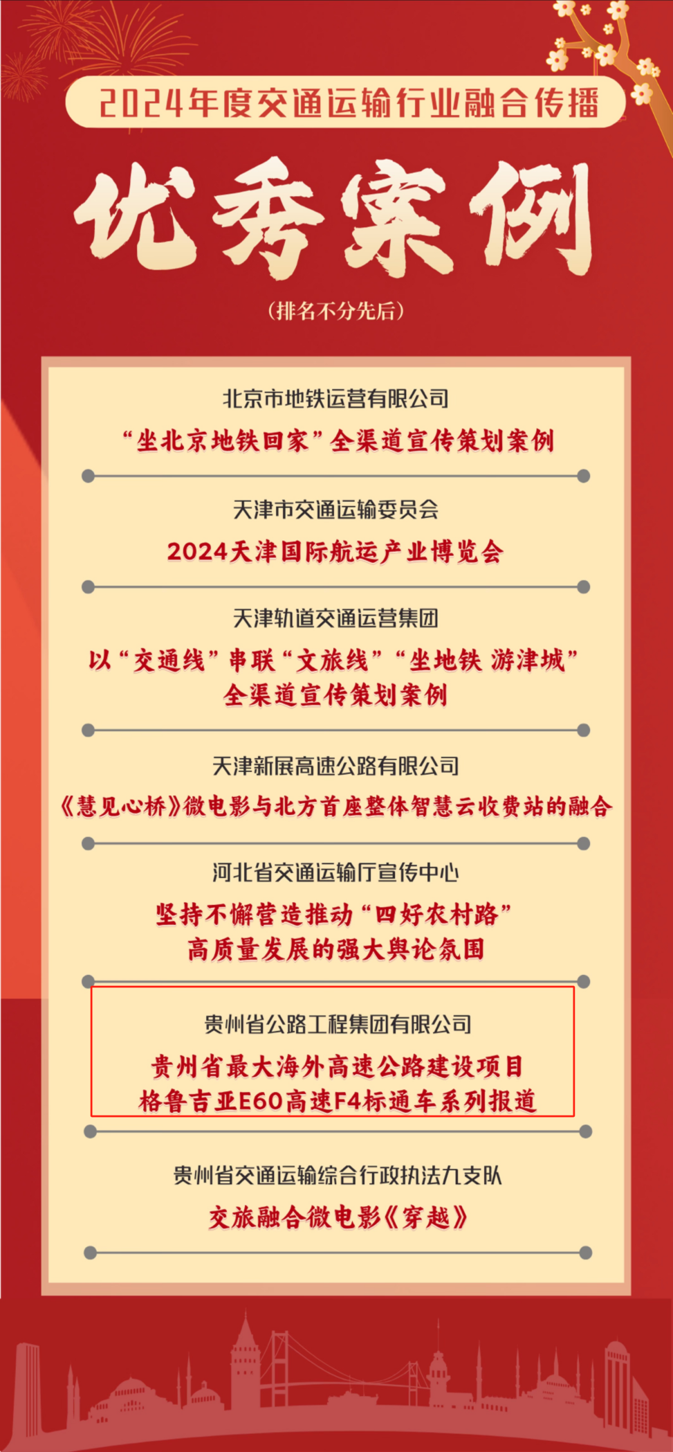 近日,由中国交通报社主办、交通运输新媒体运营联盟协办的“2024年交通运输行业融合传播优秀案例推选活动”结果揭晓。贵州公路集团申报的《格鲁吉亚E60高速F4标通车系列报道》凭借创新的传播策略与显著成效,从全国140余个参评案例中脱颖而出,获评2024年度交通运输行业融合传播优秀案例。