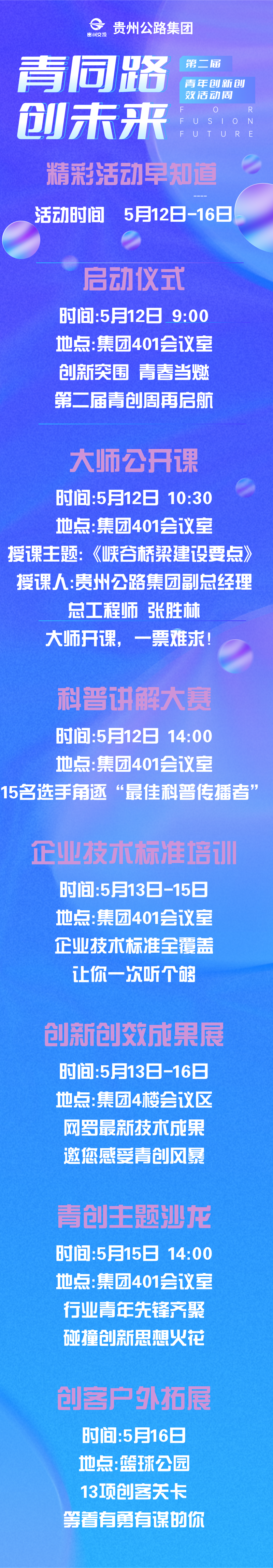 今天(5月12日),由贵州公路集团团委和总工办联合打造的第二届“青同路 创未来”青年创新创效周燃情启动。集团党委书记、董事长马白虎,党委副书记、工会主席崔文武,副总经理、总工程师张胜林,贵州省团校副教授、副校长郭芯汝,全国劳模模范、贵州交投集团科技发展部副主任郭吉平等嘉宾出席启动仪式。