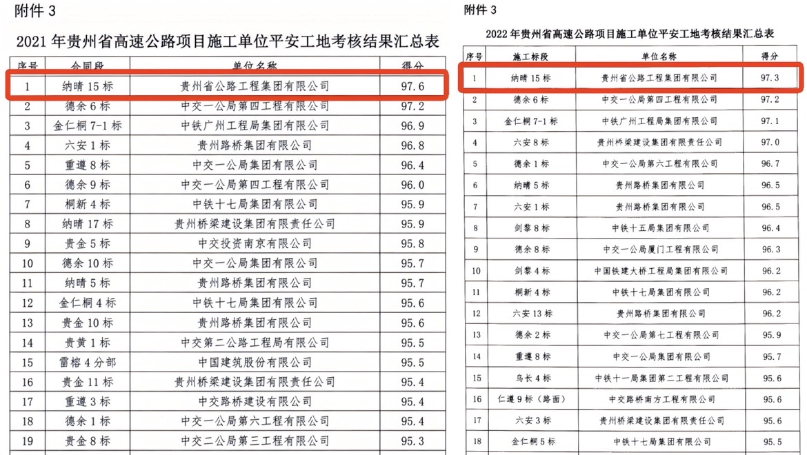 纳晴15标连续两年斩获贵州省高速公路“平安工地”考核第一名