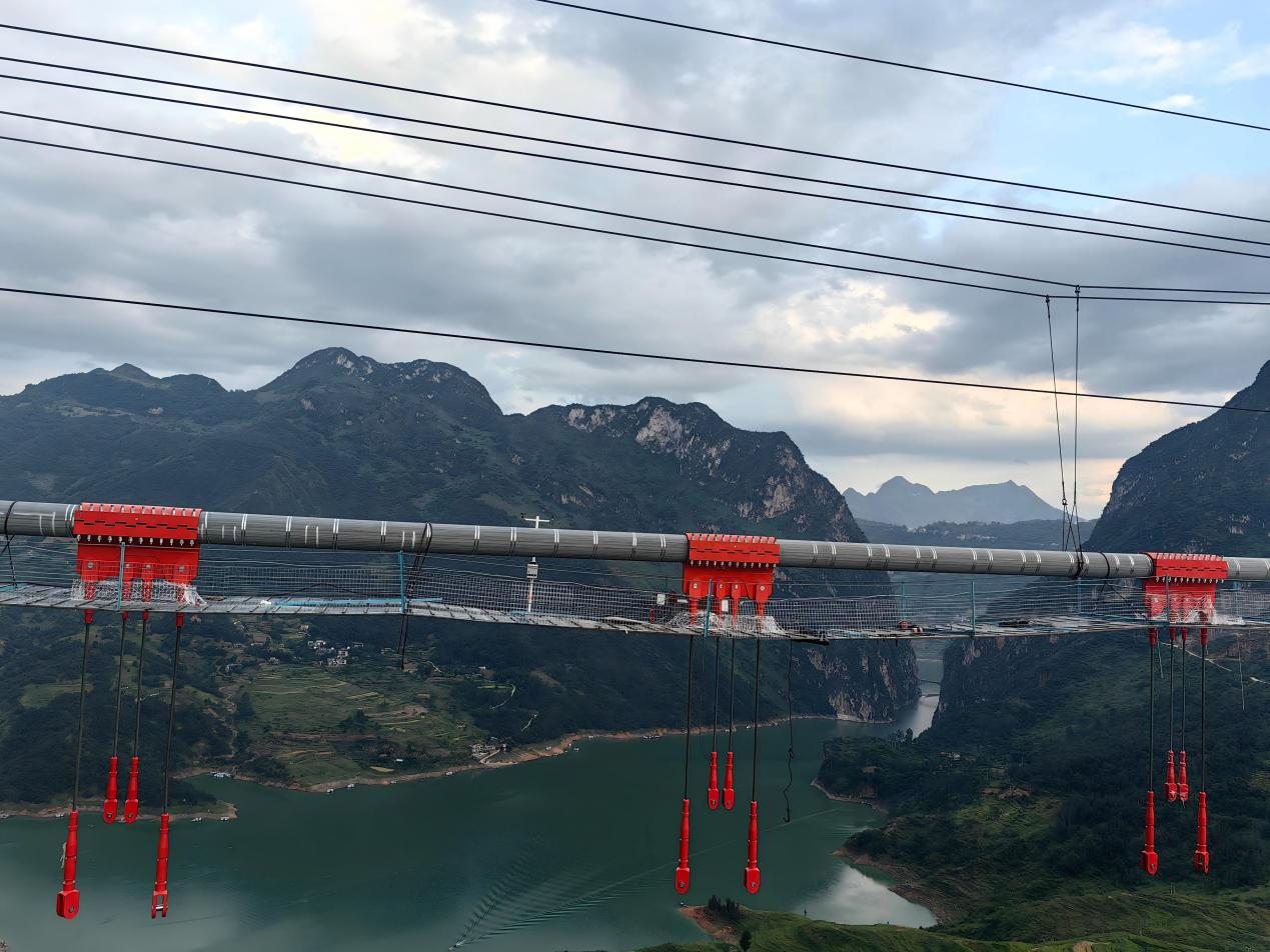 经过多次反复试验打磨,当2根吊索毫发无损地运送就位,“单台天车双吊索平衡纵向运输法”成功落地,周围喝彩四起。全桥242个索夹、296根吊索均用该工法完成施工,整体工期缩短20%,高空作业工班减少20%,临时措施费直降15%。这项源于“扁担”的巧思,还一举摘得全国微创新金奖!