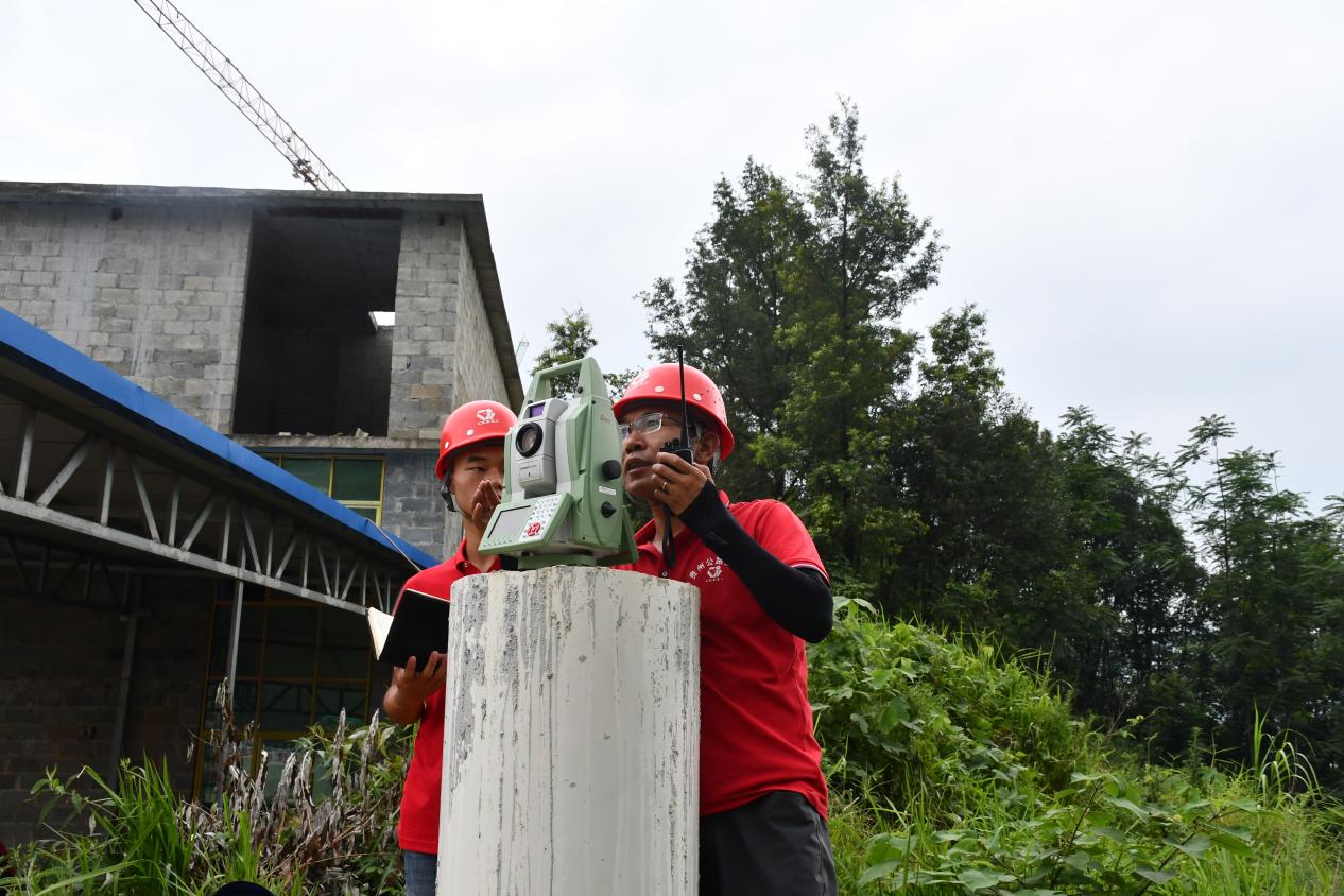 唐涛(右)与同伴在山坡上开展测量放样