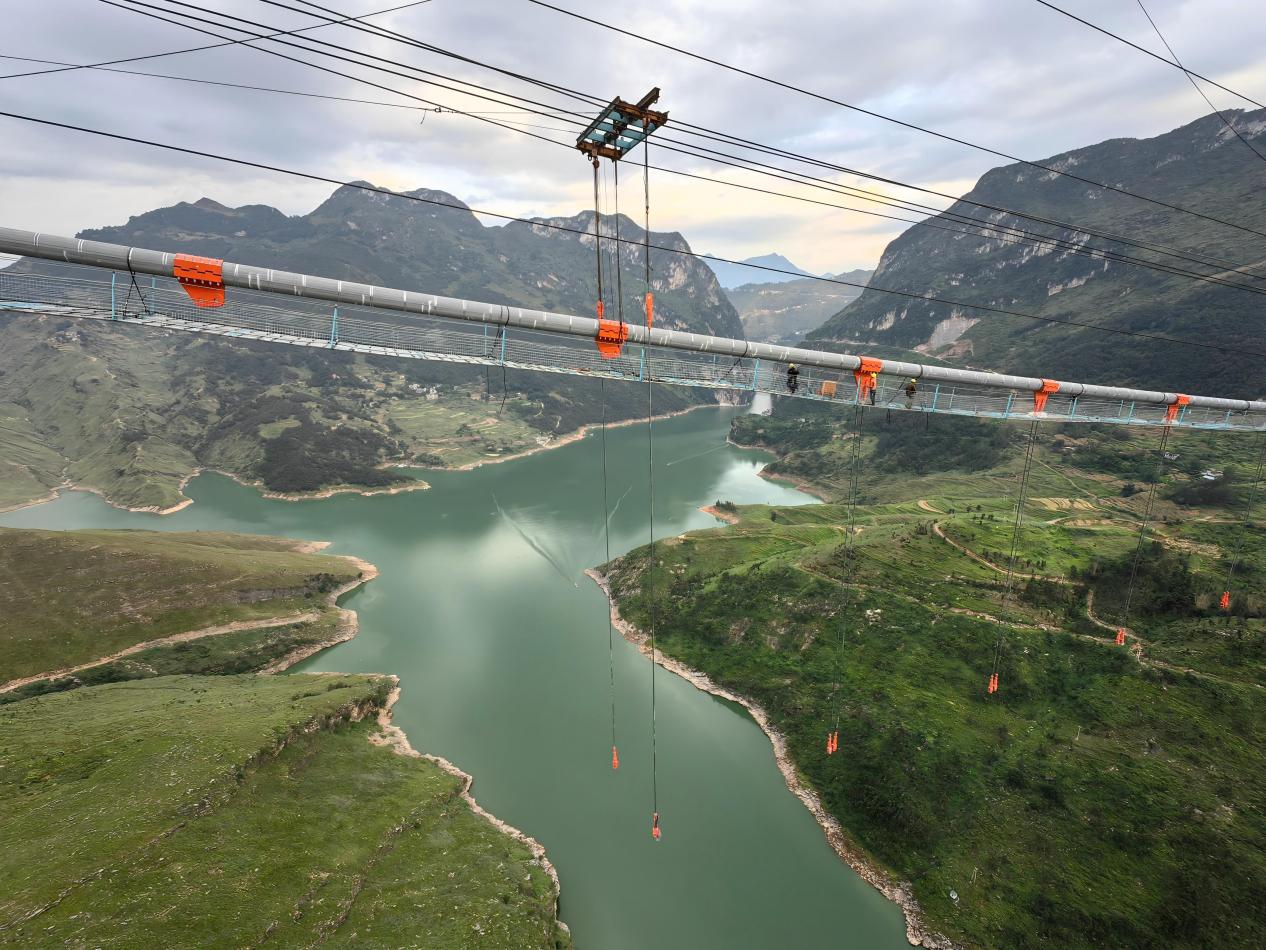 2023年,猫道主缆凌空,反抛物线划出优美弧线;