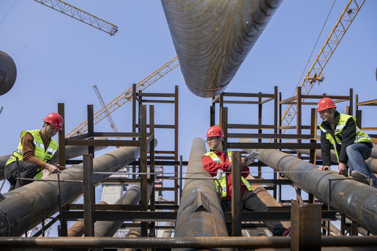 邹飘(左边)与同伴测量重力锚预应力管道间距