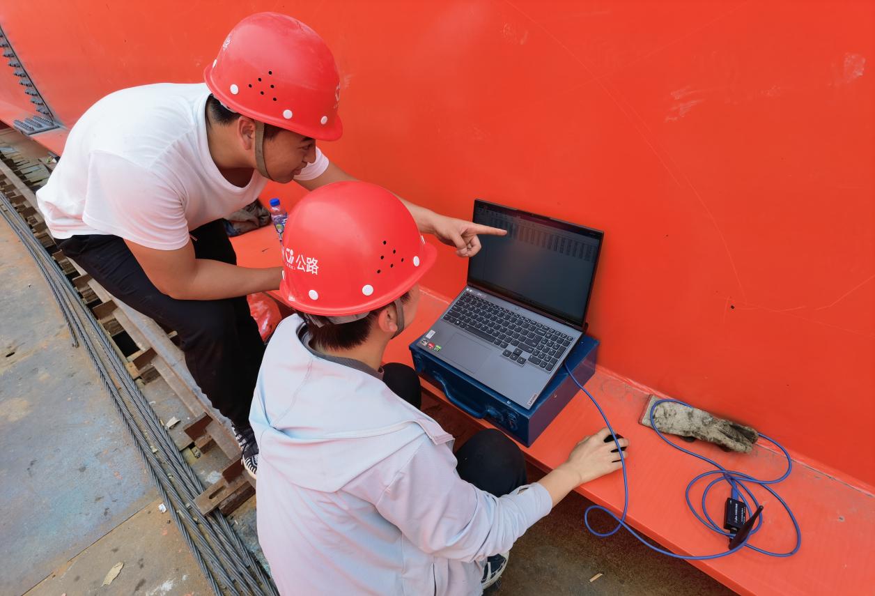 全桥103万套高强螺栓,都是悬索桥的“生命关节”。“需精准穿孔,扭力值达标。一颗螺栓松动了,桥就会‘生病’。”潘兴燕和同伴运用项目建立的钢结构工作室,引入智能扳手,手持测量仪精细化管控钢桁梁拼装现场每个环节、每道工序,实现了钢桁梁拼装螺栓通孔率100%,扭力值达到设计规范要求。