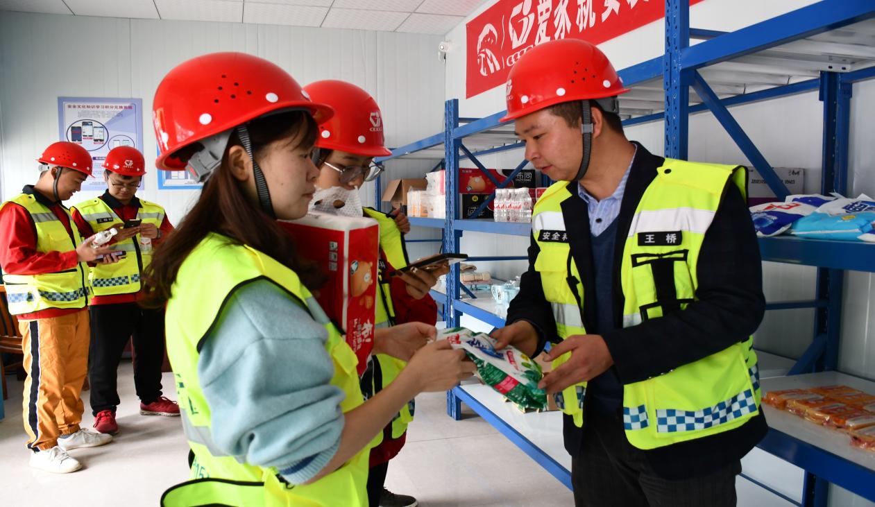 王桥(右一)在安全积分超市为项目职工用学习积分兑换生活用品