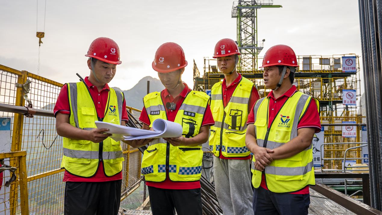翁学新(左二)在桥梁施工现场为青年职工传道解惑